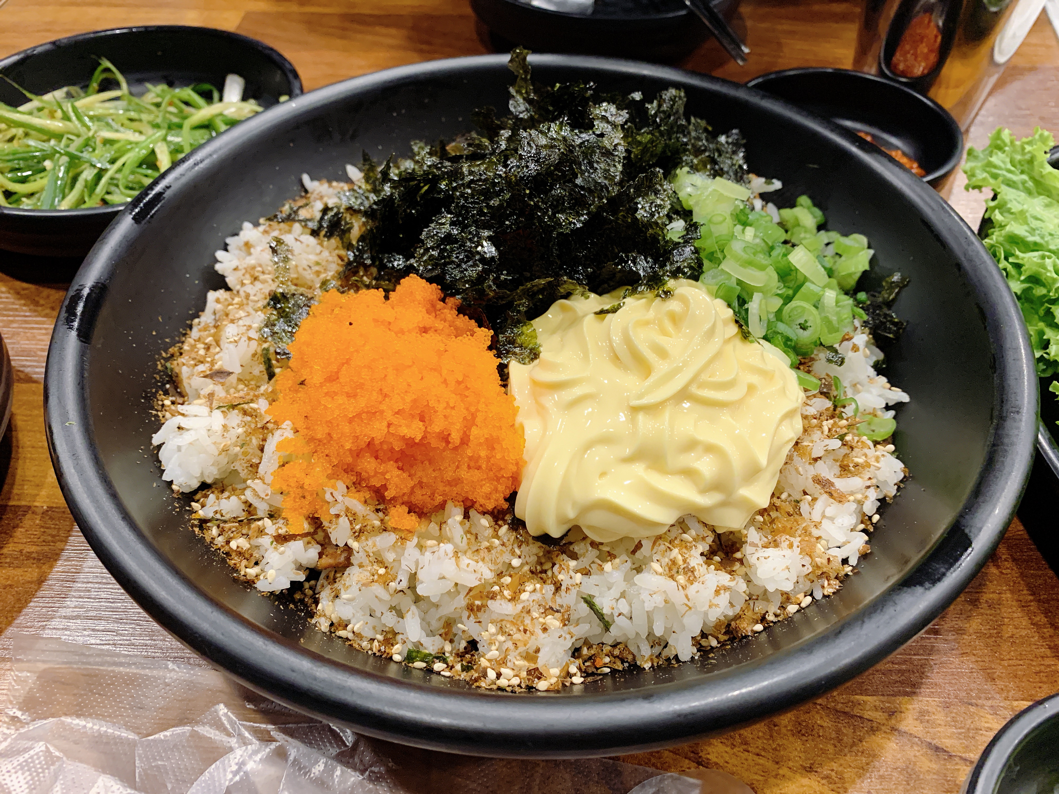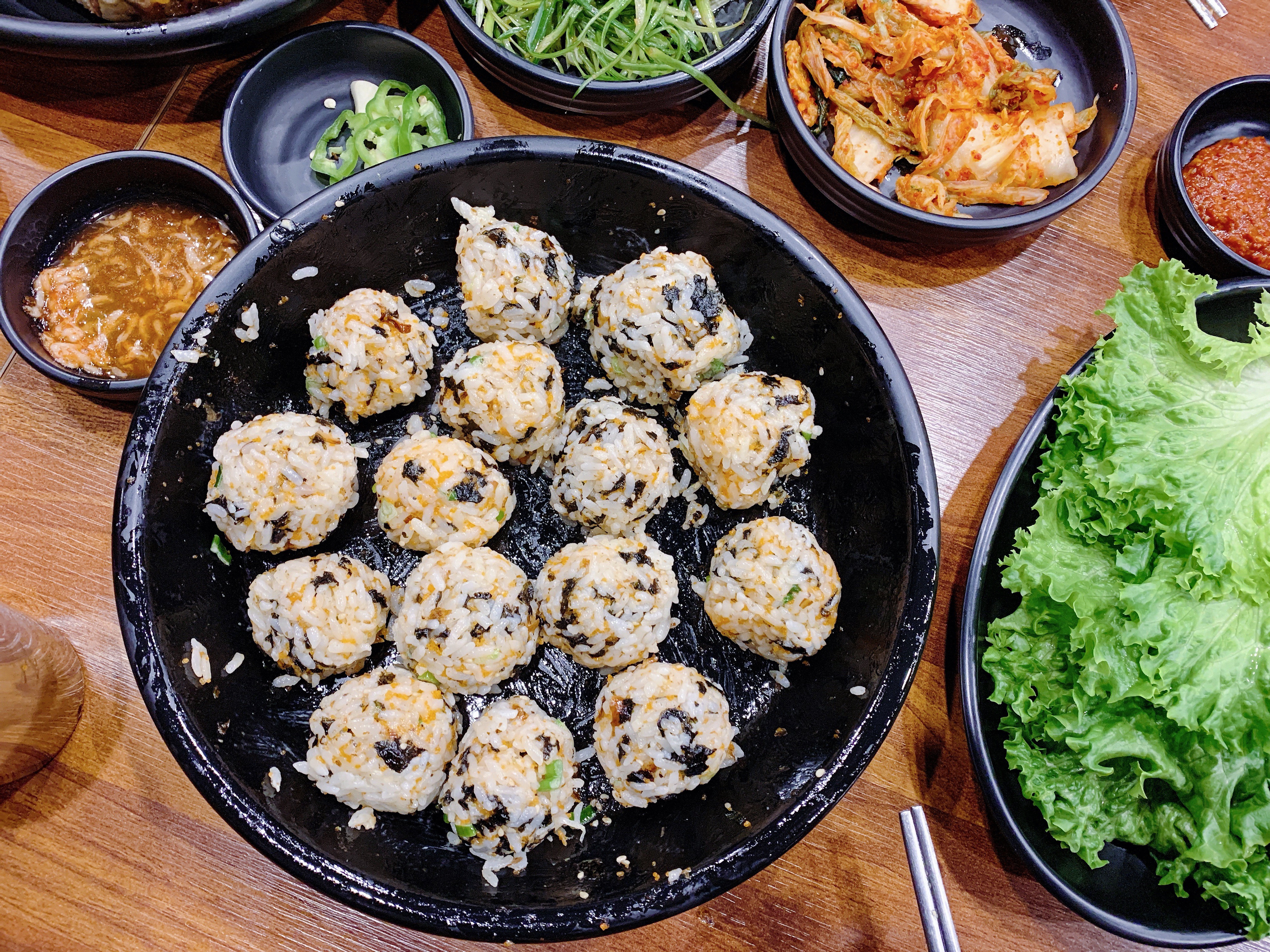 他們家的手抓飯真的也太好吃了吧 他們會給你手套自己去拌那個飯 然後要把飯搓成球叫完成了(所以叫做DIY rice balls😏